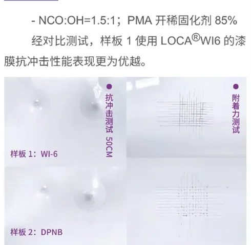 LOCA?WI6 沸點為260℃,在水性工業(yè)涂料體系可以減少配方中VOC的貢獻(xiàn),助力打造綠色環(huán)保的水性工業(yè)涂料。