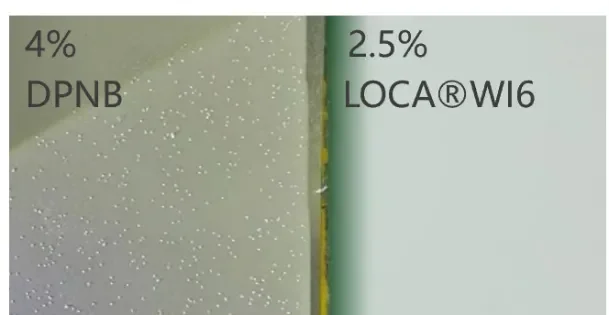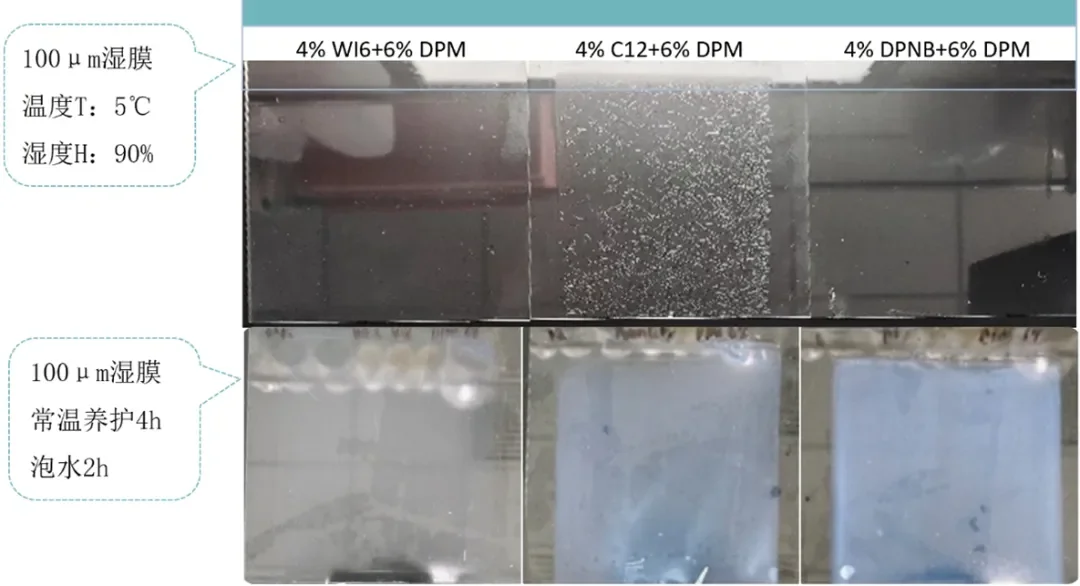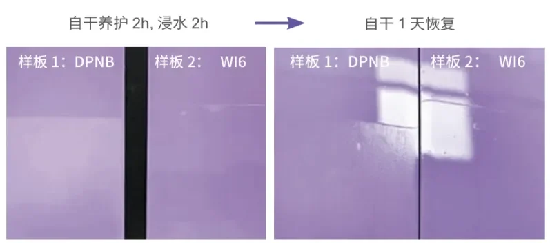 相對于傳統(tǒng)DPNB,LOCA?WI6可促進(jìn)乳膠顆粒之間的融合,從而提高漆膜致密度,組織外界水分以及各種化學(xué)物質(zhì)對漆膜的侵入,使得漆膜展現(xiàn)良好的耐水白性。