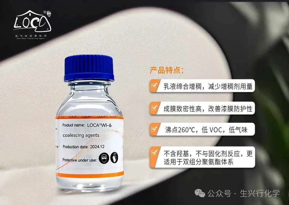 LOCA?WI6 是一種全新混合酯類成膜助劑,區別于傳統醇醚酯類溶劑,其結構不具有羥基,可以減少水與固化劑的副反應,從而延長活化期,改善施工性。