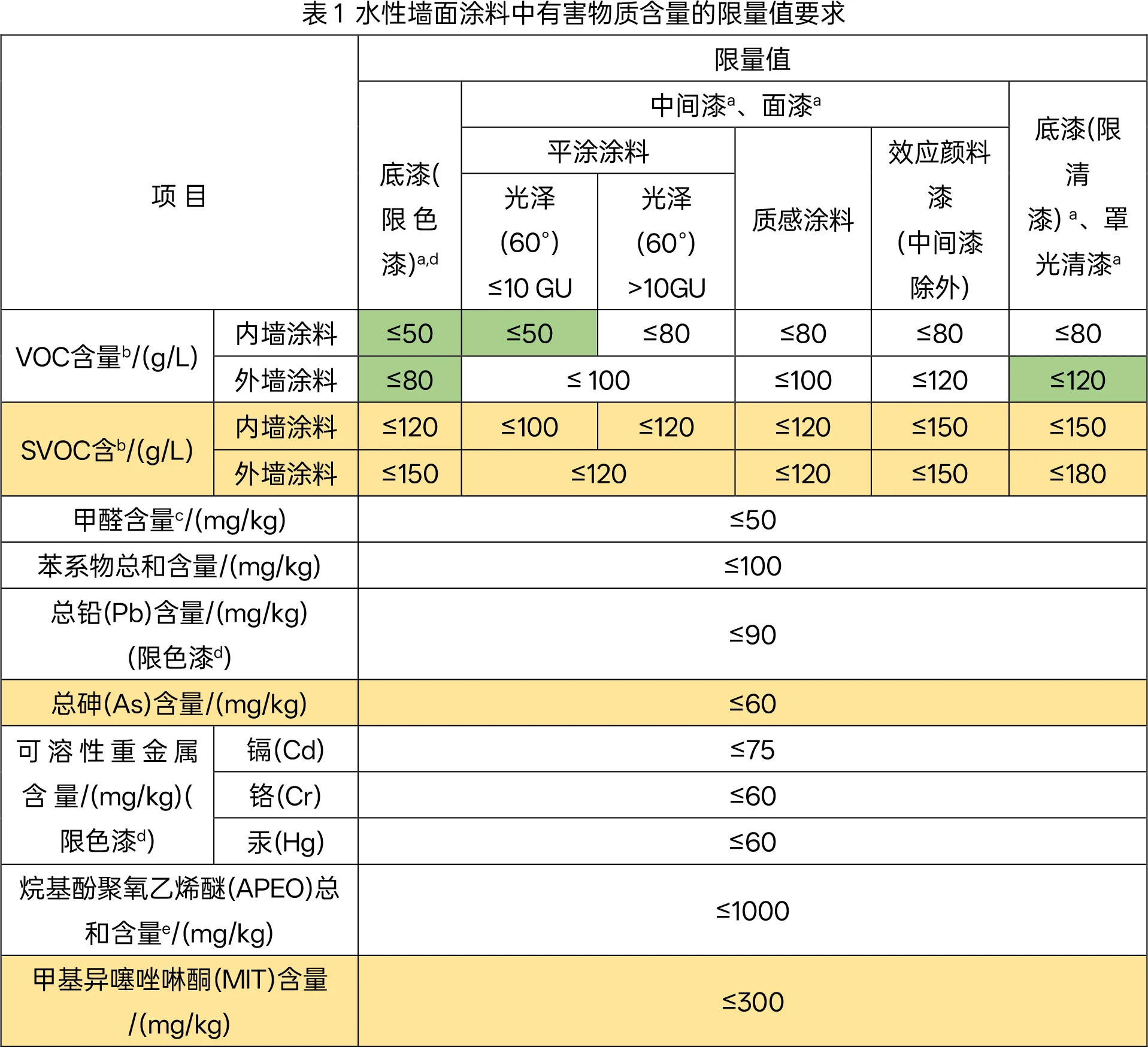 1.水性墻面涂料增加了“SVOC含量”、“總砷(AS)含量”、“甲基異噻唑啉酮(MIT)含量”項目及指標;調整了內墻涂料的底漆(色漆)、光澤(60°)≤10 GU的平涂的VOC含量指標;水性墻面涂料的烷基酚聚氧乙烯醚(APEO)總和含量;控制品種增加了壬基酚和辛基酚。