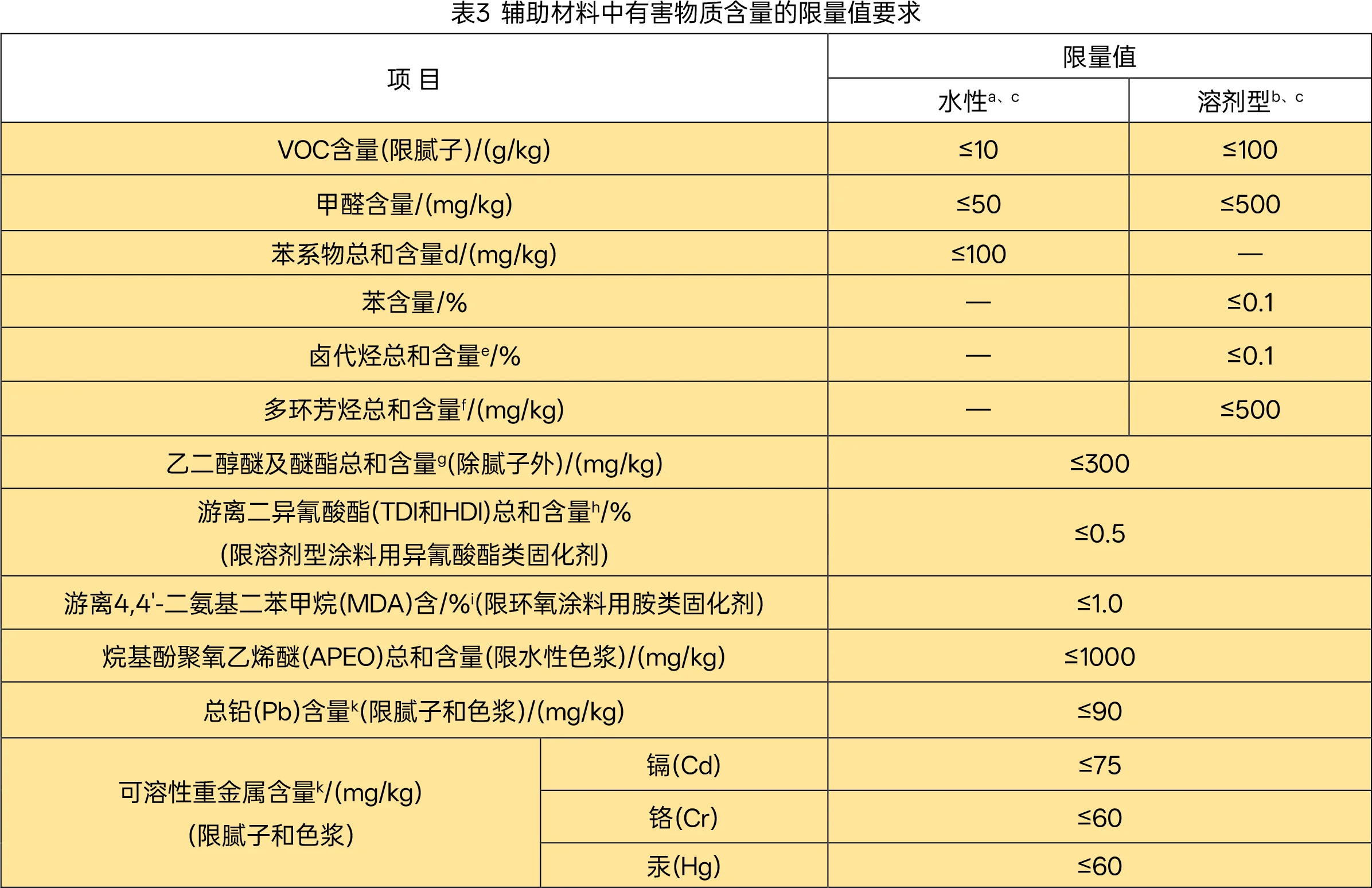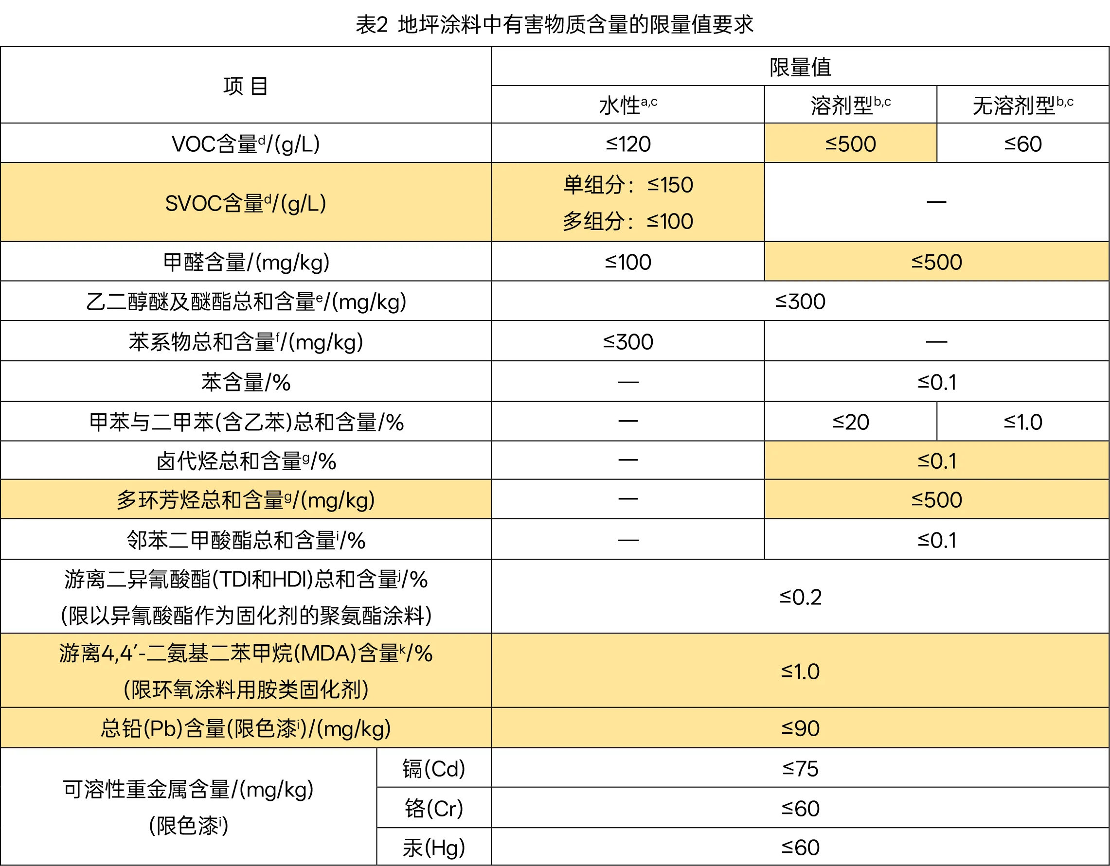 2.地坪涂料增加了“SVOC含量”、“鹵代烴總和含量”、“多環芳烴總和含量”、“游離4,4,-二氨基二苯甲烷(MDA)含量”、“總鉛(Pb)含量”項目及指標;增加了溶劑型、無溶劑地坪涂料的甲醛含量指標;調整了溶劑型地坪涂料的VOC含量指標。