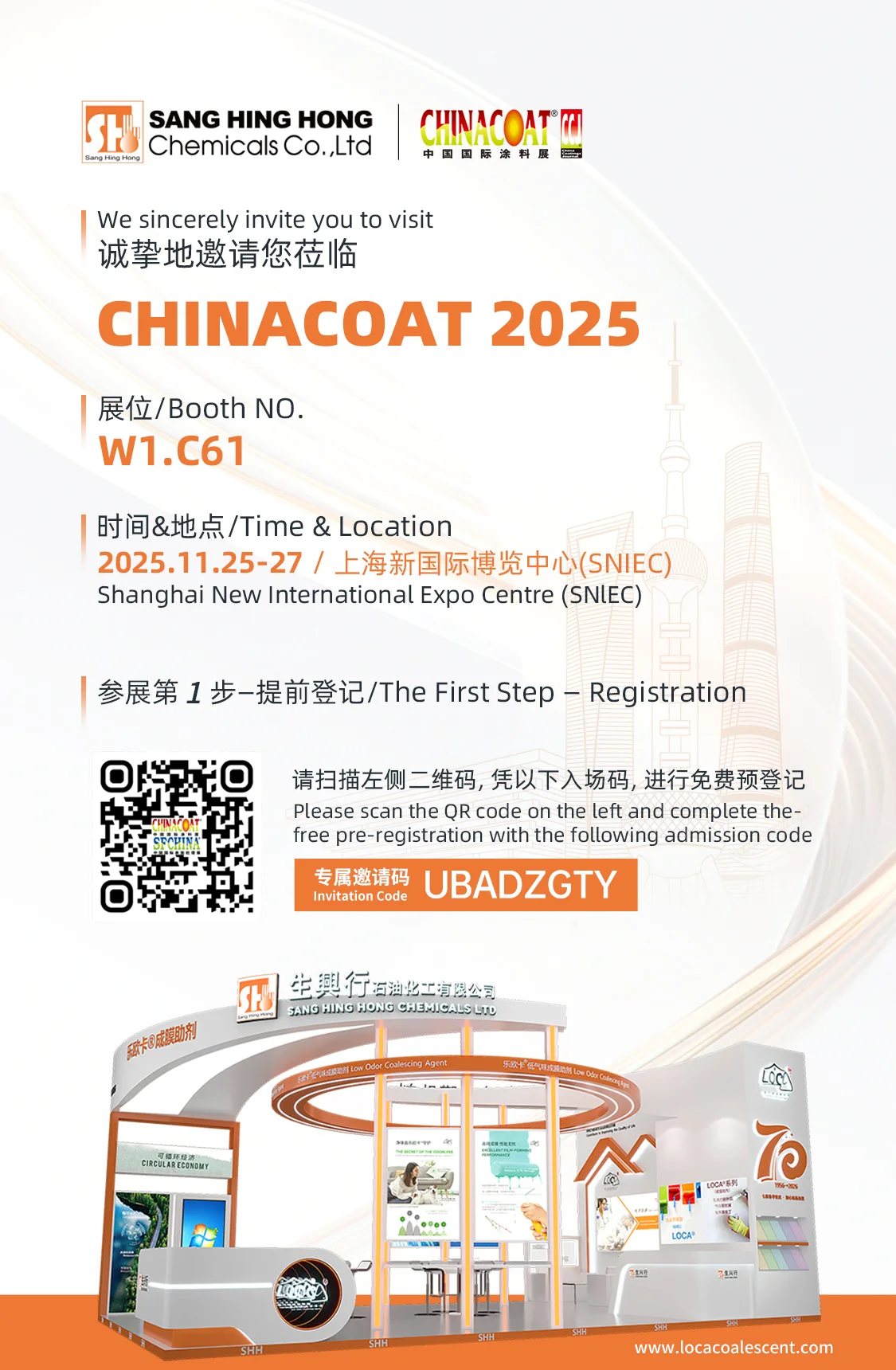 2025年11月25~27日,CHINACOAT將在上海新國際博覽中心隆重舉行。在此,我們誠摯地邀請您蒞臨生興行石油化工有限公司(Sang Hing Hong Chemical)的展臺(W1.C61),讓我們一起拉開涂料行業專屬的靈感碰撞舞臺的序幕。